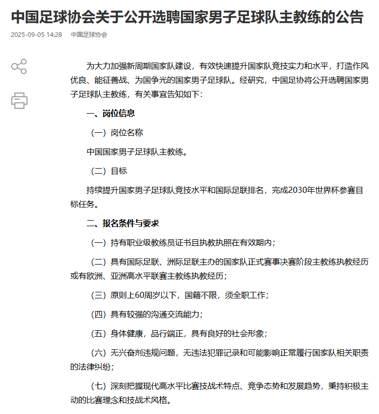 9月5日下午,中国足球协会发布公开选聘国家男子足球队主教练公告,目标将是持续提升国家男子足球队竞技水平和国际足联排名,完成2030年世界杯参赛目标任务。